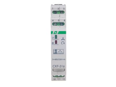 Czujnik kolejności i zaniku faz CKF-316 marki F&F to zaawansowane urządzenie zabezpieczające, zaprojektowane z myślą o ochronie trójfazowych silników elektrycznych. Urządzenie monitoruje parametry sieci 3 × 400 V + N, reagując natychmiastowo na zanik napięcia w co najmniej jednej fazie lub wystąpienie asymetrii napięciowej przekraczającej stały próg zadziałania wynoszący 55 V. Dzięki zastosowaniu przekaźnika jako elementu wykonawczego o maksymalnym prądzie obciążenia 10 A, czujnik może bezpośrednio sterować cewką stycznika w układzie automatyki.
