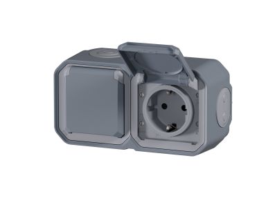 Wodoodporne podwójne gniazdo natynkowe Plexo przeznaczone jest do podłączania sprzętu elektrycznego lub elektronicznego w dowolnym miejscu, w którym wymagana jest odporność na wodę, kurz i uderzenia. Do użytku wewnątrz i na zewnątrz budynków.Kolor szary. Standard Schuko.