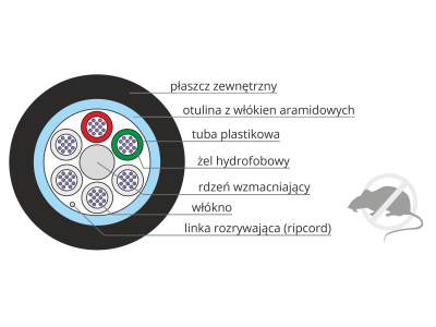 Ośrodek kabla stanowi centralny element wytrzymałościowy w postaci rdzenia z tworzywa sztucznego otoczony luźnymi tubami, w których znajdują się włókna światłowodowe. Wnętrze tub wypełnia żel lub włóknina hydrofobowa, które stanowią izolację przeciwwilgociową. Całość ośrodka pozostaje otoczona i zabezpieczona tworzywem sztucznym oraz włóknami aramidowymi, stanowiącymi bezpieczną zaporę antygryzoniową. Tuba zielona jest tubą kierunkową.
