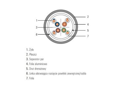 Instalacyjny kabel skrętkowy SecurityNET przeznaczony jest do wykonywania połączeń pomiędzy punktami dystrybucyjnymi sygnałów multimedialnych, a gniazdami przyłączeniowymi użytkowników. Kabel skrętkowy F/UTP (ekranowany) idealnie nadaje się do instalacji w sieciach komputerowych, telefonicznych, systemach CCTV itp., narażonych na zakłócenia elektromagnetyczne. Zastosowanie ekranu minimalizuje ryzyko zakłóceń, które występować mogą np. przy ułożeniu kabla we wspólnym korytku z kablem prądowym. Posiada powłokę zewnętrzną LSZH. Kabel spełnia wymagania norm okablowania strukturalnego: ISO/IEC 11801, EN 50173, EIA/TIA 568-C.2.