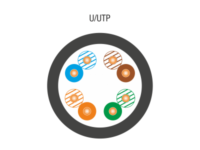 Przewód nieekranowany U/UTP (Unshielded/Unshielded Twisted Pair, oznaczenie zgodne z normą ISO/IEC 11801).
