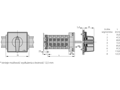Łącznik krzywkowy 15A, 3 pozycyjny montaż na szynę