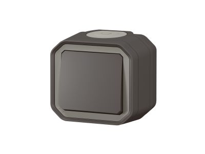 Wodoodporny łącznik natynkowy Plexo steruje jednym obowodem oświetlenia. Może być używany w trybie schodowym z drugim produktem. Do użytku wewnętrznego lub zewnętrznego. Kolor antracyt.