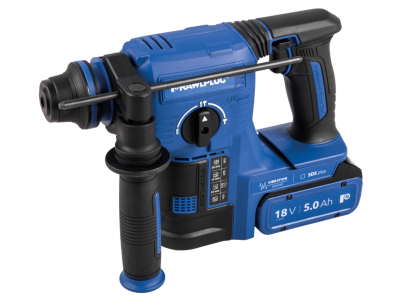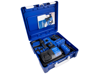 Bezszczotkowa młotowiertarka SDS plus R-PRH18-24-XL2 o napięciu 18 V i energii udaru 2,1 J. W zestawie dwie baterie Li-Ion 5,0 Ah oraz ładowarka 6,5 A w walizce. Przeznaczona do wiercenia w betonie zbrojonym, cegle, kamieniu, stali i drewnie.