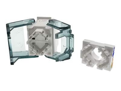 Typ Keystone Jack określający wymienny moduł/gniazdo RJ45, RJ12, RJ11. Wszechstronny i standardowy komponent używany głównie w systemach okablowania strukturalnego, telekomunikacji i CCTV. Jest to element toru transmisyjnego, który można łatwo zainstalować w panelach krosowych, gniazdach ściennych oraz innych rodzajach osprzętu montażowego. W rozwiązaniu beznarzędziowym (toolless) dzięki samozaciskowej konstrukcji, instalacja jest niezwykle prosta i nie wymaga użycia żadnych narzędzi, co znacząco przyspiesza proces montażu.