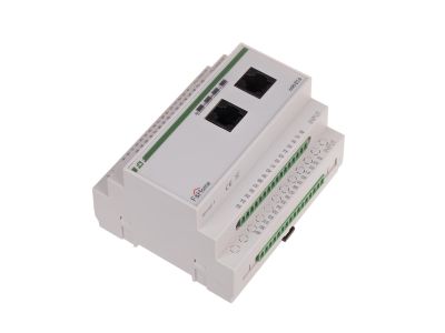 Alternatywny kod produktu: mH-E16 / 2Nadaje się zarówno do sterowania roletami zewnętrznymi (antywłamaniowymi) zasilanymi silnikami 230V lub 24V, jak również żaluzjami pionowymi i poziomymi. Moduł montowany jest w rozdzielni i zajmuje pole 6 modułów i zasilany jest napięciem 24VDC. Do wejść modułu sprowadzane są przyciski rozlokowane na budynku, podłączona za pomocą przewodów typu UTP. Moduł zarządza silnikami rolet lub żaluzji na zasadzie góra-dół (lub prawo-lewo) za pośrednictwem przekaźnikowych modułów wykonawczych typu mH-R8x8 lub mH-R2x16. Sterowanie odbywa się w pełni po linii niskiego napięcia 24V, co zapewnia pełne bezpieczeństwo i możliwość dowolnego rozmieszczenia przycisków sterujących w budynku. Moduł mH-E16 komunikuje się z panelami dotykowymi poprzez linię CAN. Dowolne wyjście modułu może być wyzwolone z poziomu paneli dotykowych poprzez wybranie konkretnego urządzenia lub sceny (grupy urządzeń). Z poziomu panelu dotykowego istnieje możliwość zaprogramowania czasowego samoczynnego załączania/wyłączania urządzeń lub grup urządzeń sterowanych z modułu wejść/wyjść. W przypadku potrzeby stosowania większej ilości wejść/wyjść można zastosować kilka modułów silnikowych, przy czym należy pamiętać że muszą to być moduły kolejnych poziomów (mH-E16 – poziom 1, mH-E16-poziom 2…). Wejścia/wyjścia Wejścia modułu mH-E16 przystosowane są do podłączenia łączników monostabilnych (dzwonkowych) zasilanych napięciem bezpiecznym 24V. Do sterowania każdego z silników przeznaczone są dwa wejścia (góra/dół lub lewo/prawo). Wyzwolenie wejścia następuje w momencie zamknięcia łącznika i podania +24V na wejście modułu. Wyjścia modułu mH-E16 przystosowane są do współpracy z modułami wyjść przekaźnikowych typu mH-R8x8 lub mHR2x16. Dobór ilości oraz rodzaju modułów przekaźnikowych zależny jest od ilości i wielkości obciążenia odbiorników. Oprogramowanie modułu uniemożliwia jednoczesne załączenie napędów na ruch w obu kierunkach. Moduł mH-E16 oferowany jest w wykonaniu na różne poziomy, umożliwiając w ten sposób rozbudowę sieci wejść/wyjść podłączonych do systemu F&Home. W pierwszej kolejności należy instalować moduł z poziomu 1, następnie z poziomu 2, itd. Każdy z poziomów charakteryzuje się oddzielną numeracją, dzięki czemu zapewniony jest łatwiejszy montaż instalacji. Zestawienie wejść/wyjść dla modułu mH-E16 przedstawione jest w poniższej tabeli. Zasada działania Wejścia modułu podzielone są na pary umożliwiające sterowanie kolejnymi silnikami podłączonym poprzez moduły przekaźnikowe. Wyzwolenie wejścia powoduje załączenie wyjścia odpowiadającego wyzwolonemu wejściu tak długo, jak długo wyzwolone będzie wejście. W oprogramowaniu sterownika zdefiniowany jest maksymalny czas załączenia napędu, jego przekroczenie spowoduje zatrzymanie silnika pomimo zamkniętego łącznika. Wyjścia umożliwiają załączanie poprzez moduły przekaźnikowe mH-R8x8 lub mH-R2x16 obwodów silnikowych. Dla każdego silnika przewidziane są dwa przekaźniki umożliwiające realizację ruchu w dwóch kierunkach, przy czym oprogramowanie modułu uniemożliwia jednoczesne wymuszenie ruchu w dwóch kierunkach. Wyjścia mogą być wyzwalane lokalnie i wtedy przekaźniki załączony będzie tak długo jak załączony będzie łącznik na wejściu (przy czym narzucone jest ograniczenie w postaci maksymalnego czasu załączenia silnika. Dodatkowo wyjścia mogą być wyzwalane zdalnie z panelu dotykowego i wtedy przekaźnik załączany jest na zdefiniowany okres czasu.