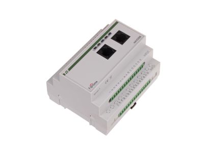 Alternatywny kod produktu: mH-IO32 / 2Moduł wejść/wyjść mH-IO32 jest podstawowym modułem systemu F&Home wyposażonym w 32 wejścia i 32 wyjścia binarne (działające na zasadzie włącz-wyłącz). Moduł montowany jest w rozdzielni (zajmuje pole 6 modułów) i zasilany jest napięciem stałym 24V. Do wejść modułu sprowadzane są przyciski rozlokowane na budynku, podłączone za pomocą przewodów typu UTP. Moduł zarządza oświetleniem i innymi odbiornikami na zasadzie włącz-wyłącz za pośrednictwem przekaźnikowych modułów wykonawczych typu mH-R8x8 lub mH-R2x16. Sterowanie odbywa się w pełni po linii niskiego napięcia 24V, co zapewnia pełne bezpieczeństwo i możliwość dowolnego rozmieszczenia przycisków sterujących w budynku. Moduł mH-IO32 komunikuje się z panelami dotykowymi poprzez linię CAN. Dowolne wyjście modułu może być wyzwolone z poziomu paneli dotykowych poprzez wybranie konkretnego urządzenia lub sceny (grupy urządzeń). Z poziomu panela dotykowego istnieje możliwość zaprogramowania czasowego samoczynnego załączania/wyłączania urządzeń lub grup urządzeń sterowanych z modułu wejść/wyjść. Dodatkowo cztery wejścia modułu dedykowane są do sterowania poprzez sieć CAN pracą modułu ściemniaczy oświetlenia typu mH-LH4. W przypadku potrzeby stosowania większej ilości wejść/wyjść można zastosować kilka modułów IO, przy czym należy pamiętać że muszą to być moduły kolejnych poziomów (mH-IO32 – poziom 1, mH-IO32-poziom 2…). Wejścia / wyjścia Wejścia modułu mH-IO32 przystosowane są do podłączenia łączników monostabilnych (dzwonkowych) lub bistabilnych zasilanych napięciem bezpiecznym 24V. Wyzwolenie wejścia następuje w momencie zamknięcia łącznika i podania +24V na wejście modułu. Wyjścia modułu mH-IO32 przystosowane są do współpracy z modułami wyjść przekaźnikowych typu mH-R8x8 lub mHR2x16. Dobór ilości oraz rodzaju modułów przekaźnikowych zależny jest od ilości i wielkości obciążenia odbiorników. Moduł mH-IO32 oferowany jest w wykonaniu na różne poziomy, umożliwiając w ten sposób rozbudowę sieci wejść/wyjść podłączonych do systemu F&Home. W pierwszej kolejności należy instalować moduł z poziomu 1, następnie z poziomu 2, itd. Każdy z poziomów charakteryzuje się oddzielną numeracją, dzięki czemu zapewniony jest łatwiejszy montaż instalacji. Zasada działania Wyzwolenie wejścia z funkcją bezpośredniej zmiany stanu wyjścia (wejście 1-27) powoduje zmianę na przeciwnym stanu wyjścia o tym samym numerze co wyzwolone wejście. Na przykład pierwsze wyzwolenie wejścia numer 1 spowoduje załączenie wyjścia numer 1, drugie wyzwolenie – wyłączenie wyjścia, a kolejne wyzwolenie – ponowne załączenie. W module na poziomie pierwszym znajduje się specjalne dedykowane wejście 28 Wyłącz wszystko umożliwiające wyłączenie za pomocą jednego przycisku wszystkich obwodów. Cztery ostatnie wejścia modułu (29-32) przeznaczone są do sterowania poprzez sieć CAN modułem ściemniacza typu mH-LH4 (ważne jest aby moduł ściemniacza był na tym samym poziomie co moduł IO). W takim wypadku działanie wejść ściemniających jest następujące: krótkie wyzwolenie wejścia spowoduje pełne załączenie oświetlenia (lub pełne wyłączenie gdy światło jest włączone). W przypadku dłuższego wyzwolenia następuje zmiana jasności oświetlenia związanego z wyzwolonym wejściem w pętli rozjaśniania do pełnej jasności - ściemnianie aż do wyłączenia – rozjaśnianie do pełnej jasności. Wyjścia umożliwiają poprzez moduły przekaźnikowe mH-R8x8 lub mH-R2x16 załączanie obwodów oświetleniowych (lub innych działających na zasadzie włącz/wyłącz). Stan pierwszych 28 (lub 27 wejść dla poziomu 1) może być ustawiony lokalnie poprzez wyzwolenie odpowiednich wejść modułu, lub zdalnie z poziomu nadrzędnego komputera z panelem dotykowym. Pozostałe wyjścia mogą być ustawiane wyłącznie zdalnie poprzez nadrzędny komputer z panelem dotykowym.