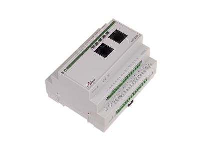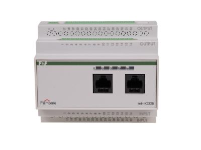 Alternatywny kod produktu: mH-IO32 / 6Moduł wejść/wyjść mH-IO32 jest podstawowym modułem systemu F&Home wyposażonym w 32 wejścia i 32 wyjścia binarne (działające na zasadzie włącz-wyłącz). Moduł montowany jest w rozdzielni (zajmuje pole 6 modułów) i zasilany jest napięciem stałym 24V. Do wejść modułu sprowadzane są przyciski rozlokowane na budynku, podłączone za pomocą przewodów typu UTP. Moduł zarządza oświetleniem i innymi odbiornikami na zasadzie włącz-wyłącz za pośrednictwem przekaźnikowych modułów wykonawczych typu mH-R8x8 lub mH-R2x16. Sterowanie odbywa się w pełni po linii niskiego napięcia 24V, co zapewnia pełne bezpieczeństwo i możliwość dowolnego rozmieszczenia przycisków sterujących w budynku. Moduł mH-IO32 komunikuje się z panelami dotykowymi poprzez linię CAN. Dowolne wyjście modułu może być wyzwolone z poziomu paneli dotykowych poprzez wybranie konkretnego urządzenia lub sceny (grupy urządzeń). Z poziomu panela dotykowego istnieje możliwość zaprogramowania czasowego samoczynnego załączania/wyłączania urządzeń lub grup urządzeń sterowanych z modułu wejść/wyjść. Dodatkowo cztery wejścia modułu dedykowane są do sterowania poprzez sieć CAN pracą modułu ściemniaczy oświetlenia typu mH-LH4. W przypadku potrzeby stosowania większej ilości wejść/wyjść można zastosować kilka modułów IO, przy czym należy pamiętać że muszą to być moduły kolejnych poziomów (mH-IO32 – poziom 1, mH-IO32-poziom 2…). Wejścia / wyjścia Wejścia modułu mH-IO32 przystosowane są do podłączenia łączników monostabilnych (dzwonkowych) lub bistabilnych zasilanych napięciem bezpiecznym 24V. Wyzwolenie wejścia następuje w momencie zamknięcia łącznika i podania +24V na wejście modułu. Wyjścia modułu mH-IO32 przystosowane są do współpracy z modułami wyjść przekaźnikowych typu mH-R8x8 lub mHR2x16. Dobór ilości oraz rodzaju modułów przekaźnikowych zależny jest od ilości i wielkości obciążenia odbiorników. Moduł mH-IO32 oferowany jest w wykonaniu na różne poziomy, umożliwiając w ten sposób rozbudowę sieci wejść/wyjść podłączonych do systemu F&Home. W pierwszej kolejności należy instalować moduł z poziomu 1, następnie z poziomu 2, itd. Każdy z poziomów charakteryzuje się oddzielną numeracją, dzięki czemu zapewniony jest łatwiejszy montaż instalacji. Zasada działania Wyzwolenie wejścia z funkcją bezpośredniej zmiany stanu wyjścia (wejście 1-27) powoduje zmianę na przeciwnym stanu wyjścia o tym samym numerze co wyzwolone wejście. Na przykład pierwsze wyzwolenie wejścia numer 1 spowoduje załączenie wyjścia numer 1, drugie wyzwolenie – wyłączenie wyjścia, a kolejne wyzwolenie – ponowne załączenie. W module na poziomie pierwszym znajduje się specjalne dedykowane wejście 28 Wyłącz wszystko umożliwiające wyłączenie za pomocą jednego przycisku wszystkich obwodów. Cztery ostatnie wejścia modułu (29-32) przeznaczone są do sterowania poprzez sieć CAN modułem ściemniacza typu mH-LH4 (ważne jest aby moduł ściemniacza był na tym samym poziomie co moduł IO). W takim wypadku działanie wejść ściemniających jest następujące: krótkie wyzwolenie wejścia spowoduje pełne załączenie oświetlenia (lub pełne wyłączenie gdy światło jest włączone). W przypadku dłuższego wyzwolenia następuje zmiana jasności oświetlenia związanego z wyzwolonym wejściem w pętli rozjaśniania do pełnej jasności - ściemnianie aż do wyłączenia – rozjaśnianie do pełnej jasności. Wyjścia umożliwiają poprzez moduły przekaźnikowe mH-R8x8 lub mH-R2x16 załączanie obwodów oświetleniowych (lub innych działających na zasadzie włącz/wyłącz). Stan pierwszych 28 (lub 27 wejść dla poziomu 1) może być ustawiony lokalnie poprzez wyzwolenie odpowiednich wejść modułu, lub zdalnie z poziomu nadrzędnego komputera z panelem dotykowym. Pozostałe wyjścia mogą być ustawiane wyłącznie zdalnie poprzez nadrzędny komputer z panelem dotykowym.