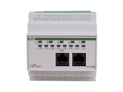 Alternatywny kod produktu: mH-V8 / 4Moduł mH-V8 jest ośmiokanałowym modułem wykonawczym sterującym pracą elektrozaworów podłączonych do wyjść modułu i przystosowany jest do pracy z modułami czujników temperatury mH-S8. Moduł montowany jest w rozdzielni i zajmuje pole 5 modułów, a napięcie zasilania modułu wynosi 230 VAC. Moduł nadaje się do sterowania elektrozaworami w obwodach ogrzewania (zazwyczaj zainstalowanymi na kolektorze) o napięciu cewki 230 VAC i działa na zasadzie włącz-wyłącz, niezależnie od głównego panelu dotykowego (stanowi autonomiczną parę z modułem mH-S8 znajdującego się na tym samym poziomie). W przypadku potrzeby stosowania podłączenia większej ilości czujników temperatury można zastosować kilka modułów mH-V8, przy czym należy pamiętać że muszą to być moduły kolejnych poziomów (mH-V8 – poziom 1, mH-V8-poziom 2, …). Wejścia / wyjścia Moduł mH-V8 oferowany jest w wykonaniu na różne poziomy, umożliwiając w ten sposób rozbudowę sieci wejść/wyjść podłączonych do systemu F&Home. W pierwszej kolejności należy instalować moduł z poziomu 1, następnie z poziomu 2, itd. Każdy z poziomów charakteryzuje się oddzielną numeracją, dzięki czemu zapewniony jest łatwiejszy montaż instalacji. Zestawienie wyjść dla modułu mH-V8 przedstawione jest w poniższej tabeli. Zasada działania Moduł wykonawczy mH-V8 sterowany jest poprzez sieć CAN z modułu czujnikowego mH-S8 znajdującego się na tym samym poziomie. W zależności od ustalonego programu pracy oraz wskazania temperatury na danym wejściu czujnikowym wyzwolone będzie odpowiednie wyjście modułu mH-V8. Para modułów mH-S8 – mH-V8 działa niezależnie od głównego panelu dotykowego, który służy tylko do ustalenia programu pracy. Uszkodzenie lub brak panelu dotykowego nie przerywa pracy układu regulacji temperatury.