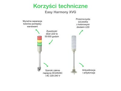 Produkt ten jest częścią gamy Easy Harmony XVG, oferty monolitycznych kolumn świetlnych Ø 60mm. Jest to kompletna, wstępnie okablowana i zmontowana monolityczna kolumna świetlna. Wyposażona jest w czerwone i zielone światło stałe Oferuje konfigurowalne kombinacje kolorów. Ta kolumna świetlna ma 24V AC / DC napięcia znamionowego. Wstępne zmontowanie i okablowanie produktu pozwalają na łatwą instalację na każdej wymaganej maszynie. Ma aluminiową rurę i waży 0,32kg Jest to produkt o stopniu ochrony IP53 i posiada certyfikaty CE i EAC. Posiada płytę mocującą przymocowaną do rury i ma wstępnie zmontowany kabel dla łatwej instalacji. Zapewnia bardziej niezawodny i wyraźny widok dzięki przezroczystej soczewce. Ta gama oferuje szeroki wybór napięcia i elastyczne opcje montażu z funkcjami wizualnymi i dźwiękowymi.