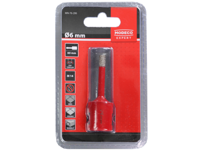 Diamentowa otwornica do bardzo twardych materiałów wykończeniowych (ceramika, gres, terakota, marmur, granit). Technologia Vacuum Brazed, gwint M14 do szlifierek kątowych, wiercenie na sucho dzięki woskowi chłodzącemu; maks. 12 000 obr./min.