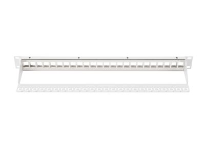 Patch-panel pusty 24-portowy przeznaczony do montażu w szafach rack 19 (483 mm) firmy DIGITUS Professional. Odpowiedni dla przewodów o średnicy AWG 22-26 (linka/drut). Wykonany z blachy stalowej walcowanej na zimno (SECC) o grubości 1,5 mm zgodnie z EN1.4301, UNS S30400, AISI 304 oraz LMSAD110. Materiał styków: fosforobrąz. Powłoka wtyków: nikiel, złoto 0,3µ. Materiał IDC Terminal: fosforobrąz 50 µ cynku na 60 µ niklu, Materiał PCB: FR4, UL 94V-0, grubość pokrycia 1,45 mm, Trwałość: ? 750 (ISO/IEC 11801, IEC 60603-7-5), Temperatura pracy: -20°C/+70°C, Rezystancja izolacji > 500MOhm.