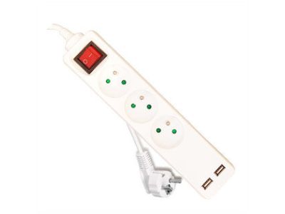 Przedłużacz z trzykrotnym gniazdem z wyłącznikiem i USB ECO, 3x2p+Z 10A 1,5m biały PS-370WS+USB/1,5