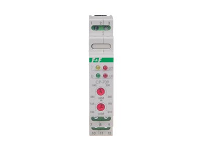 Przekaźnik napięciowy CP-709 służy do kontroli napięcia sieci jednofazowej i zabezpieczenia odbiornika jednofazowego przed skutkami wzrostu lub spadku napięcia poza ustawione wartości.
