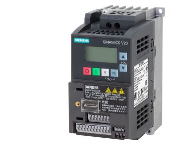 INAMICS V20 -1AC 200-240 V AC (-15% +10%) Częstotliwość sieci: 47-63 Hz Moc znamionowa: 0,55 kW Interfejs I/O: 4 DI/2 DO/2 AI/1 AO Stopień ochrony: IP20 Wielkość: FSAB Komunikacja: USS/MODBUS RTU Wbudowany panel BOP Wbudowany filtr