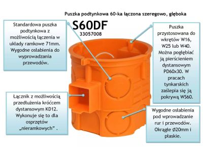 Opakowanie zbiorcze zawiera 110 szt.Puszka podtynkowa do elektroniki, szeregowa. Dane techniczne: przekrój znamionowy: 60 mmśrednica zewnętrzna: 65 mmgłebokość: 61 mm