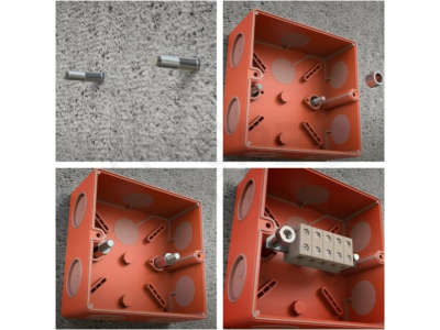 Uwaga dla systemu z zachowaniem funkcjonalności w warunkach pożaru:Puszka jest wyposażona w ceramiczną listwę 5- polową i zachowuje funkcjonalność w razie pożaru. Puszka mocowana jest do podłoża za pomocą kotew do betonu (element wyposażenia). Puszki przeznaczone są do użytku tylko dla wysokonapięciowych kabli ze sprawdzoną funkcjonalnością podczas pożaru. Łatwy montaż przewodów