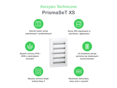 Montowana natynkowo obudowa PrismaSeT XS. Ta metalowo-plastikowa obudowa składa się z 3 rzędów po 24 moduły 18 mm. Jest przystosowana do wszystkich typów rozdzielnic modułowych. Obudowa dedykowana jest do montażu wewnątrz pomieszczeń. Stopień ochrony IP to drzwi zamknięte IP40. Wyposażona jest w przezroczyste, bezbarwne drzwi. Kolor obudowy i płyty czołowej jest biały (RAL 9003). Gotowa do użycia, jest przeznaczona do użytku w sektorach mieszkalnych i usługowych. Opracowana dla elektryków, zapewniając ergonomię i elastyczność instalacji. Kable mogą być wprowadzane przez górną lub dolną część obudowy za pomocą zdejmowanych płyt wprowadzeniowych. Umożliwia wprowadzenie kabli, rury lub instalacji. Wyposażona jest w 1 płytę tylną i 3 szyny DIN. Szyny są zdejmowane i ułatwiają okablowanie i konserwację. Jest wyposażona w 1 uziemienie i 1 neutralny blok zacisków. Blok zacisków uziemiających zapewnia 38 wyjść (6x25mm² + 32x4mm²). Neutralny blok zaciskowy zapewnia 56 wyjść (4x (3x25mm² + 11x4mm²)). Przystosowana również do pionowego rozdzielacza Acti9 VDIS o rozmiarze 24 modułów. Wyposażona w 3 etykiety identyfikacyjne, 3 ochraniacze etykiet, 1 płytkę zaślepiającą iosprzęt do mocowania okablowania. Klasa izolacji elektrycznej to Klasa II. Napięcie izolacji znamionowej Ui wynosi 400V. Kategoria przepięciowa to II. Prąd znamionowy ln wynosi do 125A. Straty mocy wynoszą 76W. Zgodna z normami IEC 60670-1 i 24, IEC 61439-1 i 3. Całkowite wymiary to (szer.) 550mm x (wys.) 600mm x (gł.) 168mm. Waga wynosi 14,560 kg. Obudowa i osłona przednia wykonane są z technoplastiku. Tylna część jest wykonana z metalu, drzwi są wykonane ze szkła. Odporność tworzywa sztucznego na płomienie i nienormalne ciepło wynosi 650°C dla obudowy i osłony przedniej. Stopień ochrony IK to IK09 z zamkniętymi drzwiami. Temperatura pracy wynosi od -25°C do 60°C.