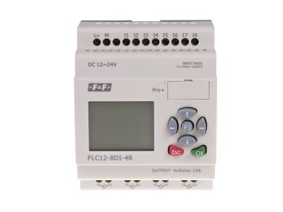 Sterownik swobodnie programowalny FLC12-8DI-4R marki F&F to zaawansowana jednostka centralna CPU, zaprojektowana z myślą o precyzyjnym sterowaniu w systemach automatyki budynkowej oraz przemysłowej. Urządzenie charakteryzuje się szerokim zakresem napięcia zasilania od 12 do 24 V DC, co zapewnia elastyczność w projektowaniu układów zasilania. Sterownik oferuje 8 wejść cyfrowych, z których aż 4 mogą pracować jako wejścia analogowe w standardzie napięciowym 0-10 V DC z 10-bitową rozdzielczością, co pozwala na dokładny pomiar parametrów fizycznych. Dodatkowo, 4 wejścia cyfrowe to wejścia szybkie o częstotliwości do 60 kHz, idealne do współpracy z enkoderami lub licznikami wysokiej częstotliwości.