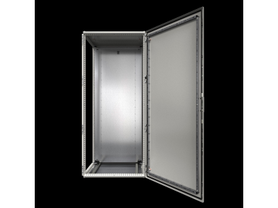 Standard w budowie szaf sterowniczych: rama szafy z podwójnymi drzwiami frontowymi, tylna ściana, płyta montażowa, płyta dachowa, dzielone płyty podłogi. Idealne przystosowanie do efektywnej zabudowy szaf.