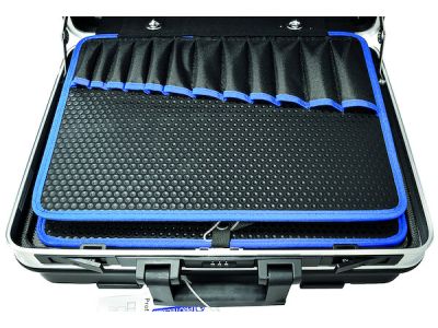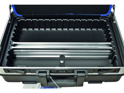 Wytrzymała, twarda walizka narzędziowa z teleskopowym uchwytem ułatwiającym przenoszenie.
