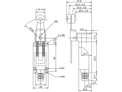Wyłącznik krańcowy, z dźwignią regulowaną i rolką1×NO+1×NC, 5A/250V AC, 20-90mm, IP65