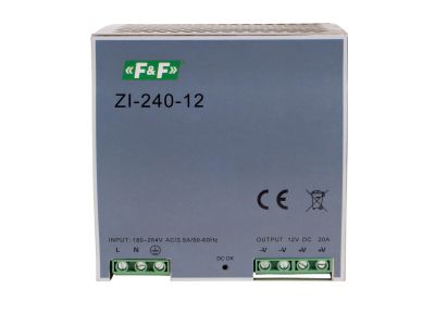 Stopień ochrony IP20 Zasilacz impulsowy. Napięcie wyjściowe 12 V. Moc 240 W.