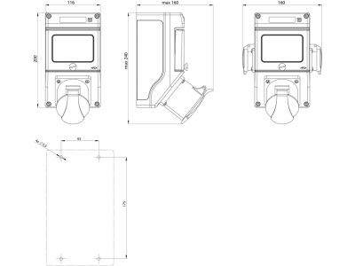 Zestaw instalacyjny bez wyłącznika nadprądowego 34/X211 (3P+N+PE 16A, 2 gniazda boczne P+N+PE 16A, M25×1,5, IP44) ZI34/X211