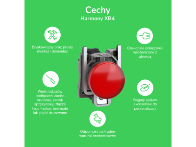 Produkt został zaprojektowany i przetestowany zgodnie z rygorystycznymi normami bezpieczeństwa i jakości, charakterystycznymi dla osprzętu sterowniczego marki Schneider Electric. Posiada certyfikat IP20, co potwierdza ochronę przed dostępem do części niebezpiecznych oraz przed obcymi ciałami stałymi o średnicy 12,5 mm i większej. Modułowa budowa jest w pełni kompatybilna z systemami Harmony XB4 (metalowa seria) oraz XB5 (plastikowa seria), co ułatwia standaryzację komponentów w zakładzie produkcyjnym.